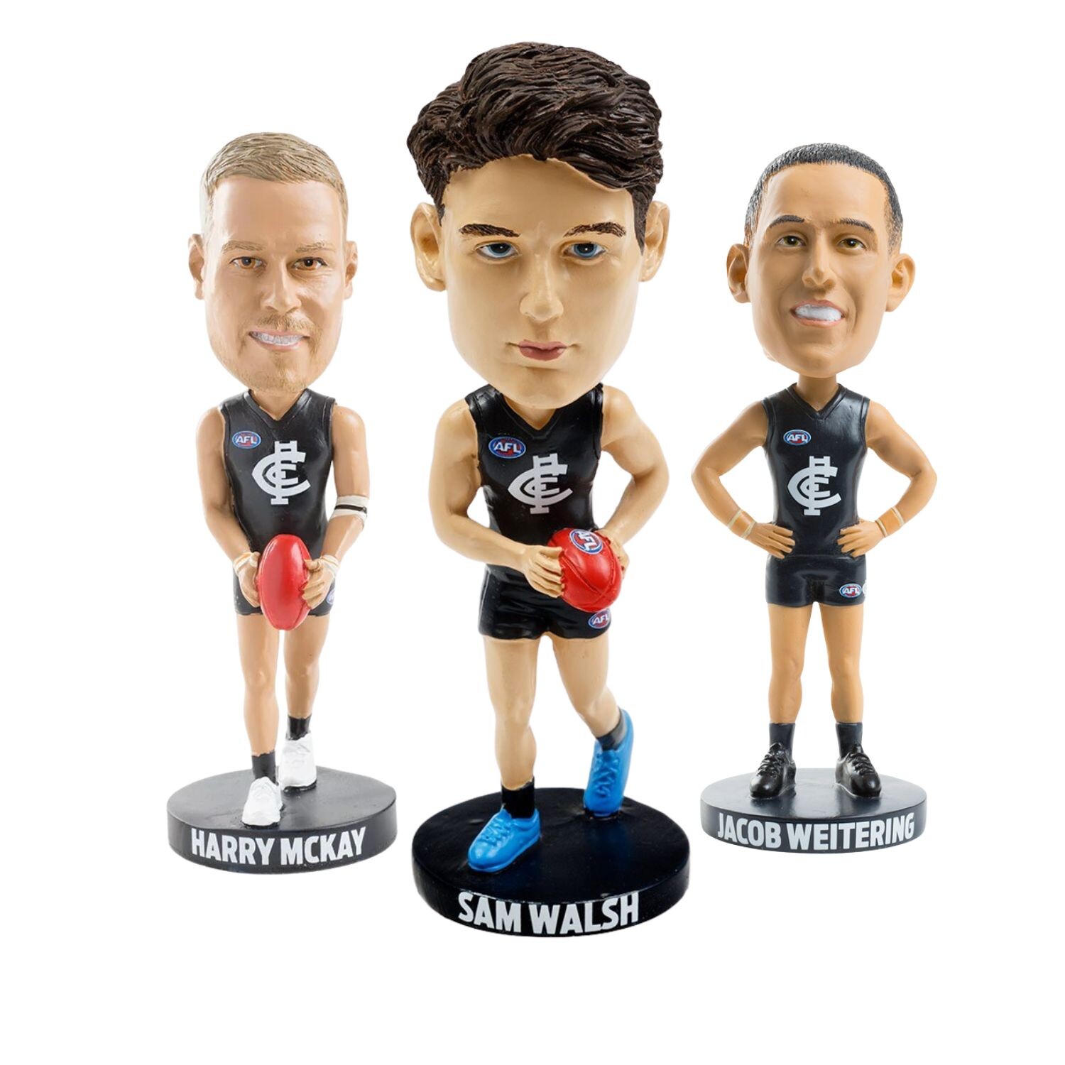 Celebrate the formidable core of the Carlton Football Club with the ultimate Carlton Blues Bobblehead Bundle. This exclusive 3 pack brings together three of the most crucial players to wear the famous Navy Blue: the midfield maestro Sam Walsh, the defensive general Jacob Weitering, and the towering goal kicker Harry McKay. Standing approximately 18cm tall, each bobblehead is an officially licensed AFL collectible that perfectly captures the unique on field presence and energy of these Blues superstars.