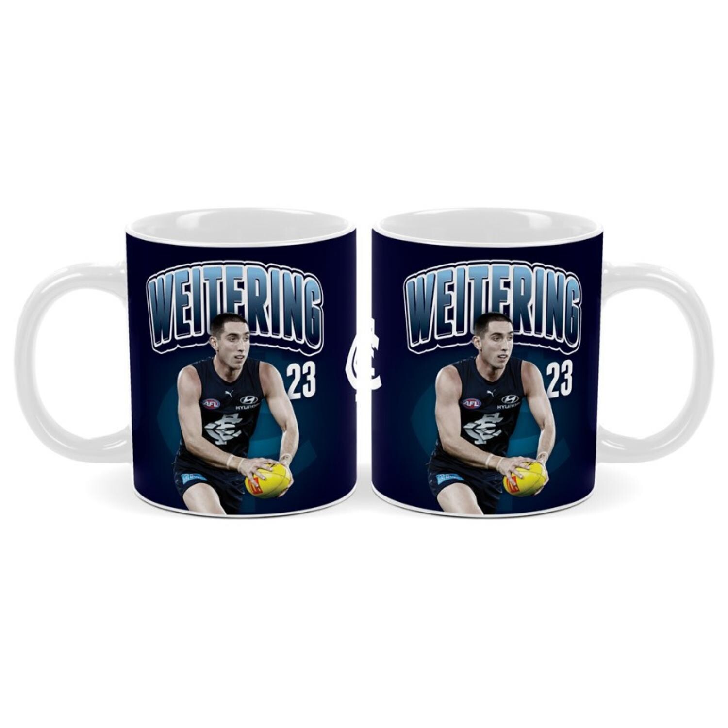Enjoy your favourite hot drink while backing your team with the official Carlton Blues Jacob Weitering Coffee Mug. Featuring a bold player graphic and club colours, this 330ml ceramic mug is perfect for home or office use.