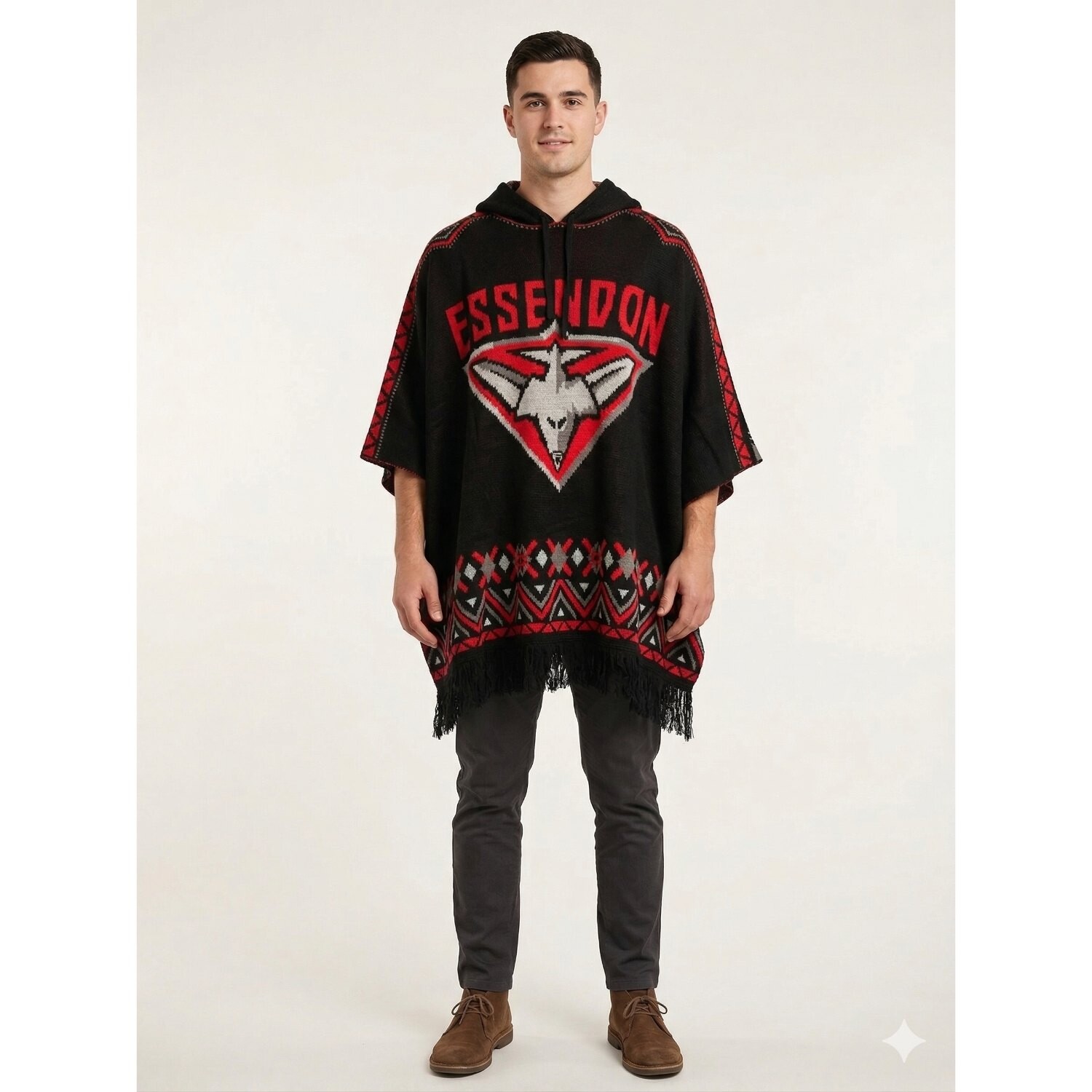 Wrap up in ultimate warmth and proudly display your club pride with the Essendon Bombers Dakota Knitted Poncho. When the winter chill sets in at the stadium, this heavy knitted accessory is the perfect way to stay comfortable without hiding your team colours. Showcasing a striking Inca-inspired print that seamlessly blends with bold team graphics, it is a standout piece for any dedicated supporter.