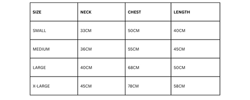 Our guernsey comes in sizes ranging from XS to L, ensuring the perfect fit for every pup. Check out the size chart below to find the ideal match for your canine companion.