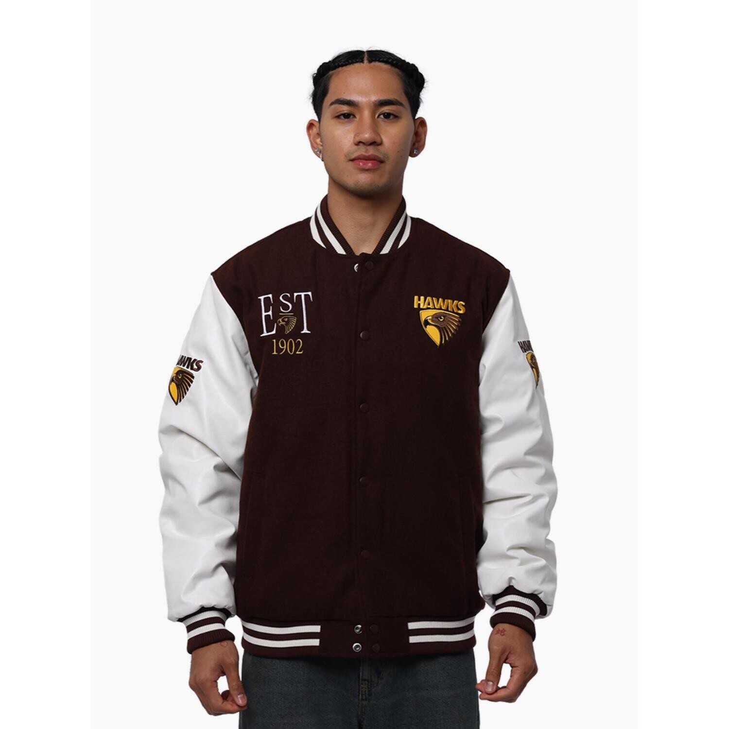 Show your team pride in timeless style with the Hawthorn Hawks Mens Script Varsity Jacket. Featuring a premium wool body and durable PU sleeves, this jacket delivers the perfect balance of comfort, warmth and classic streetwear appeal.