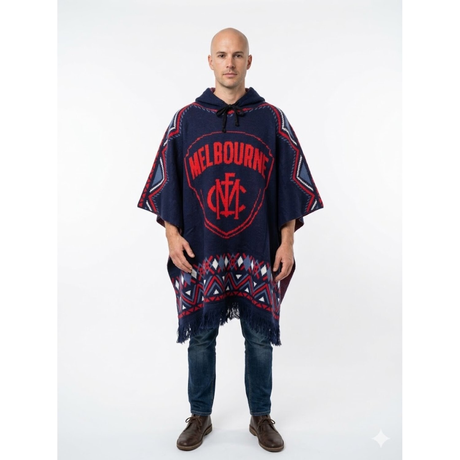 Wrap up in ultimate warmth and proudly display your club pride with the Melbourne Demons Dakota Knitted Poncho. When the winter chill sets in at the stadium, this heavy knitted accessory is the perfect way to stay comfortable without hiding your team colours. Showcasing a striking Inca-inspired print that seamlessly blends with bold team graphics, it is a standout piece for any dedicated supporter.