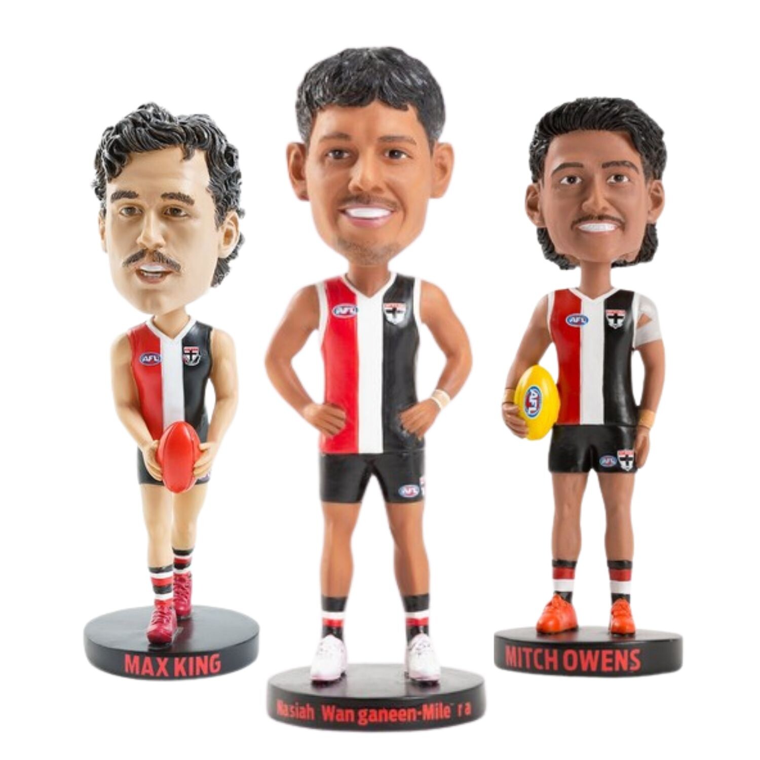 Celebrate the exciting future and rich history of the St Kilda Football Club with the ultimate St Kilda Saints Bobblehead Bundle. This exclusive 3 pack brings together three of the most dynamic players to wear the famous red, white, and black: the versatile utility Mitch Owens, the towering star forward Max King, and the silky smooth wingman Nasiah Wanganeen Milera. Standing approximately 18cm tall, each bobblehead is an officially licensed AFL collectible that perfectly captures the unique on field presence and energy of these Saints superstars.
