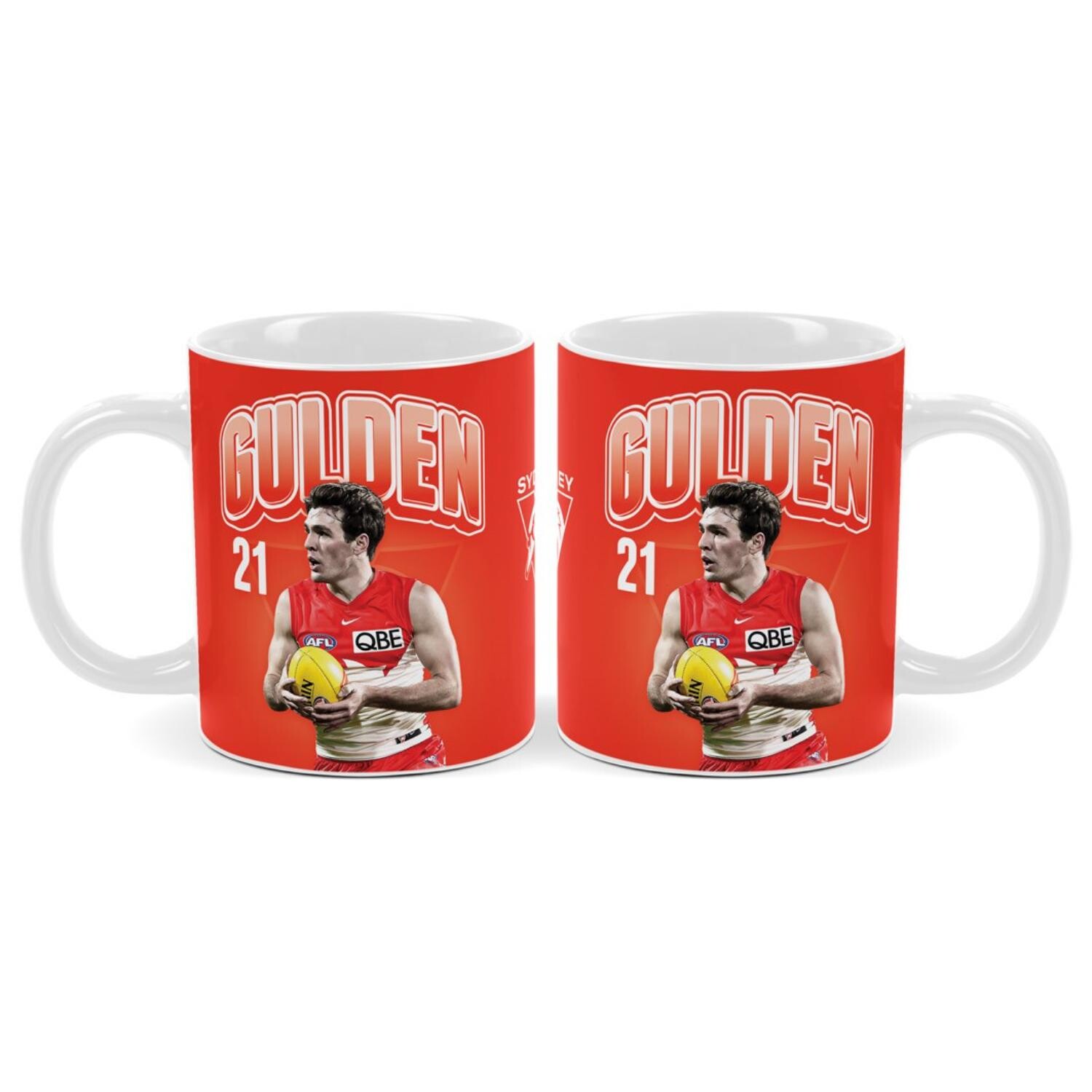 Enjoy your favourite hot drink while backing your team with the official Sydney Swans Errol Gulden Coffee Mug. Featuring a bold player graphic and club colours, this 330ml ceramic mug is perfect for home or office use.